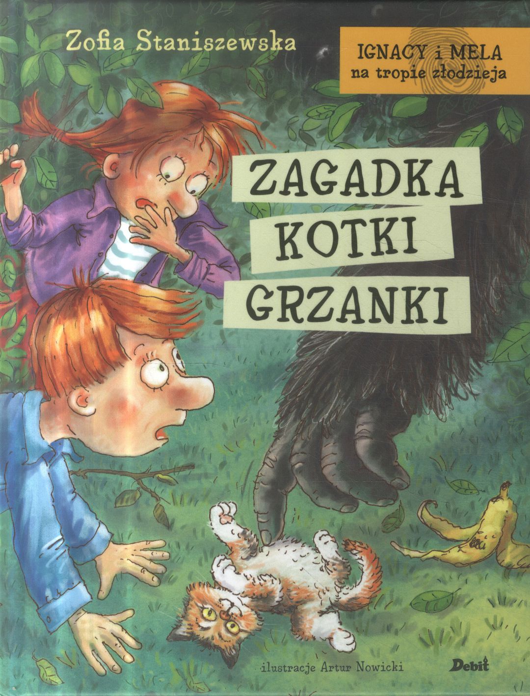 Dziesiąty tom przygód dociekliwych detektywów. Gdy do domu Ignacego i Meli wkracza bezdomna kotka Grzanka, w miarę uporządkowane życie młodych detektywów zostaje postawione na głowie. Dzieci dostają zadanie wytresowania rozbrykanego pupila. Ale nauczenie Grzanki turlania się po podłodze to pestka w porównaniu z wyzwaniem, jakie już niebawem czeka na Melę i Ignacego. Podczas rodzinnej wycieczki kotka znika... Czy młodzi detektywi odnajdą zwierzaka? I co z tym wszystkim ma wspólnego ogromny czarny stwór?